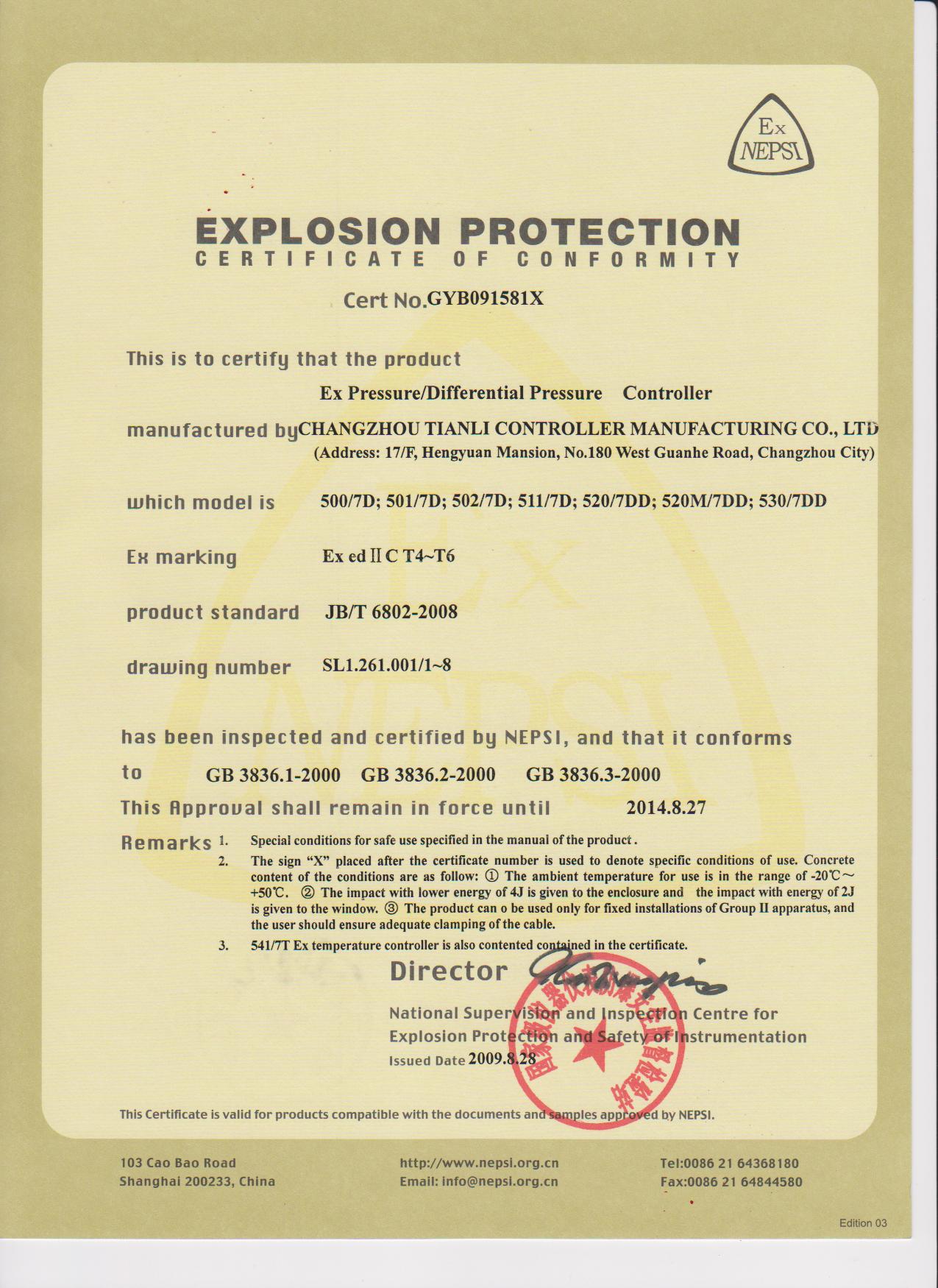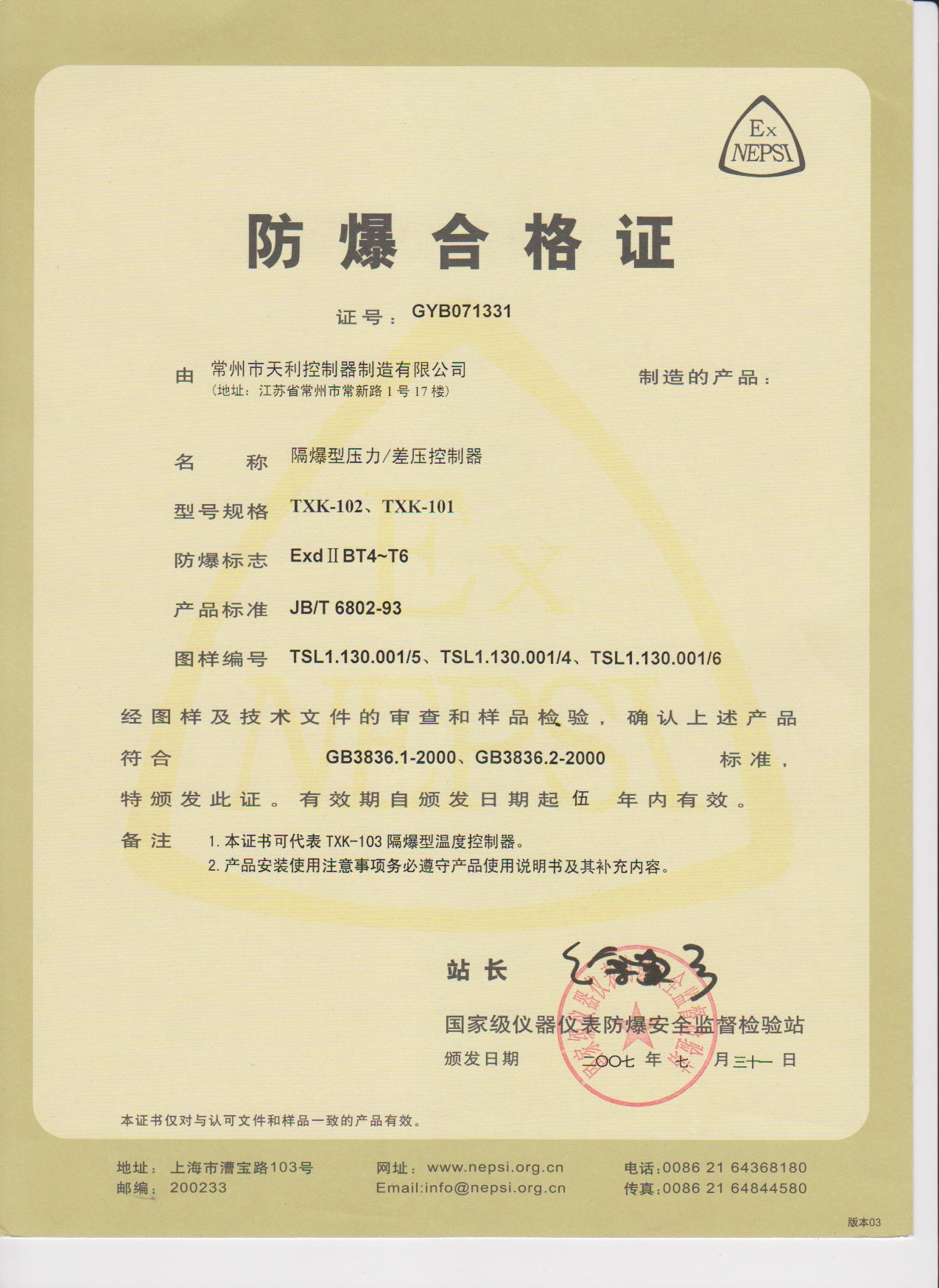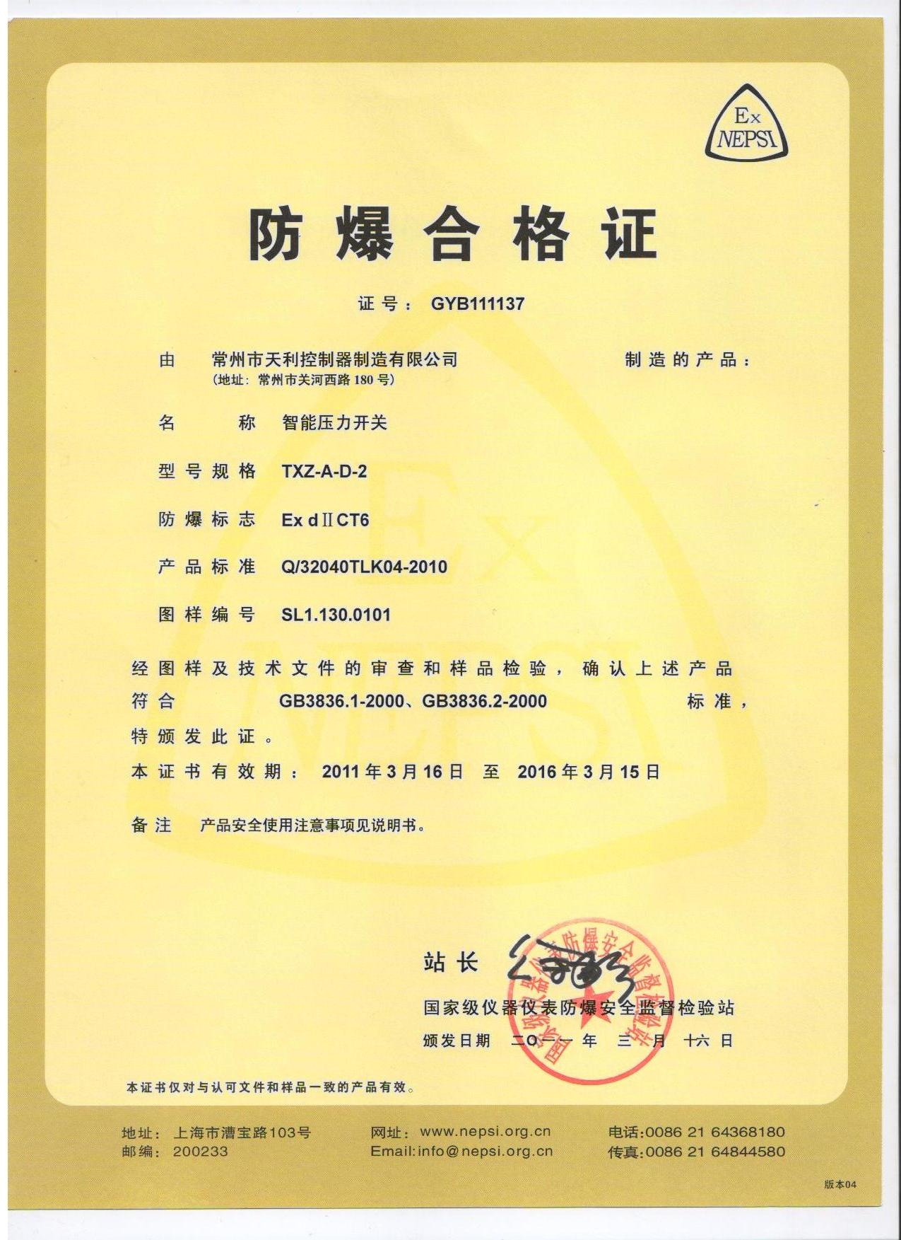 天利控制器天祥牌防爆壓力控制器各類資質(zhì)證書: